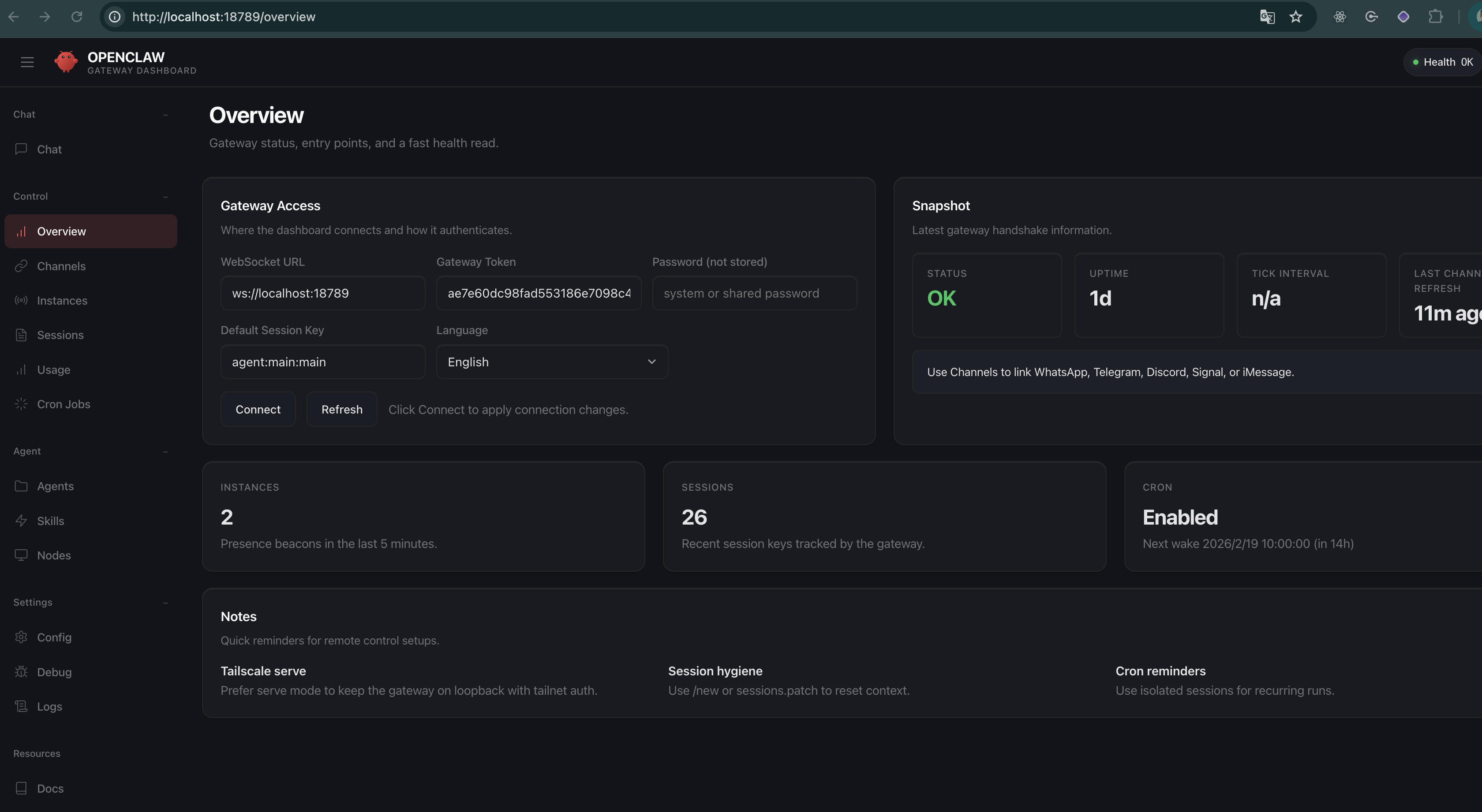 なお私は最初DockerにAliasしたPodmanを使っていたので動かずハマった。いまはDockerで動かしているが、Podmanで動かすならそれ用のドキュメントもある Podman - OpenClaw